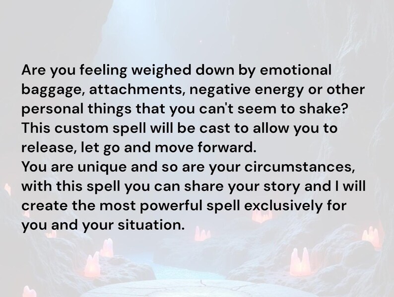 Do you feel burdened by emotional baggage, lingering attachments, negative energy, or personal struggles you just can’t seem to overcome? This personalized spell is designed to help you release, let go, and move forward with renewed clarity and strength.