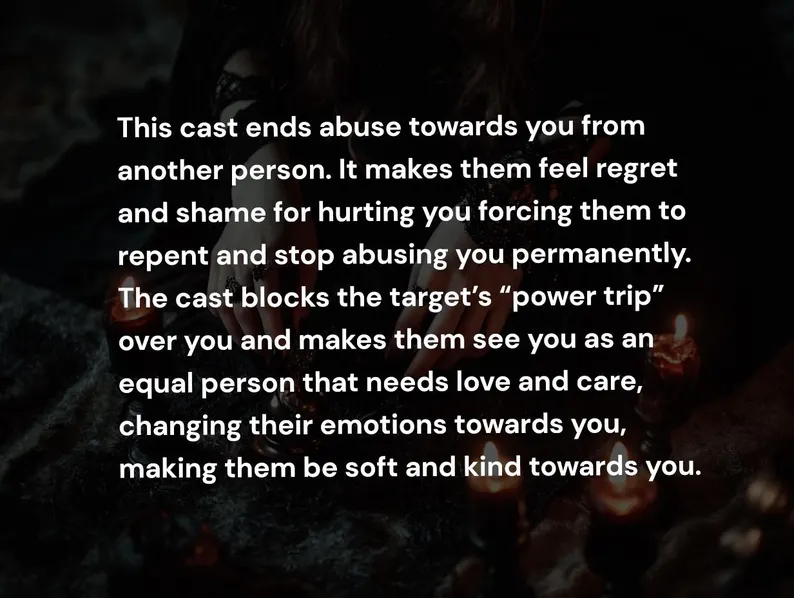This cast ends abuse towards you from another person. It makes them feel regret and shame for hurting you forcing them to repent and stop abusing you permanently. The cast blocks the target’s “power trip” over you and makes them see you as an equal person that needs love and care, changing their emotions towards you, making them be soft and kind towards you.