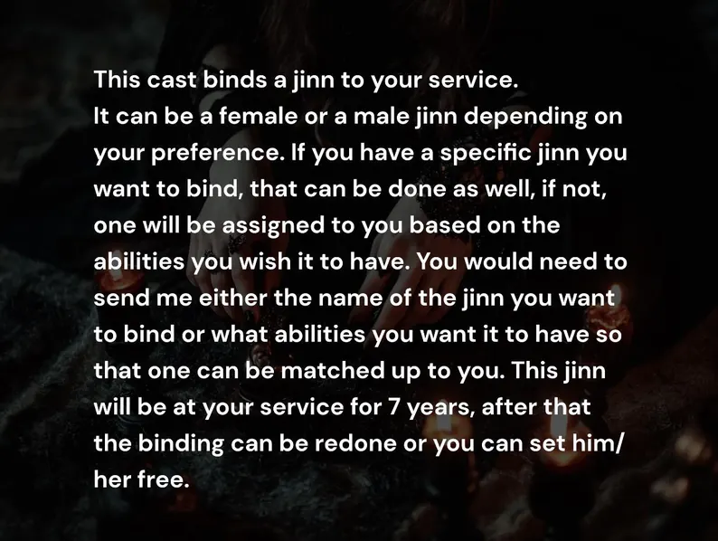 It can be a female or a male jinn depending on your preference. If you have a specific jinn you want to bind, that can be done as well, if not, one will be assigned to you based on the abilities you wish it to have. You would need to send me either the name of the jinn you want to bind or what abilities you want it to have so that one can be matched up to you. This jinn will be at your service for 7 years, after that the binding can be redone or you can set him/ her free.
