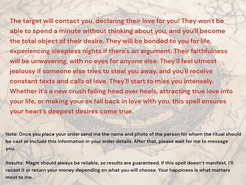 Note: Once you place your order send me the name and photo of the person for whom the ritual should be cast or include this information in your order details. After that, please wait for me to message you.