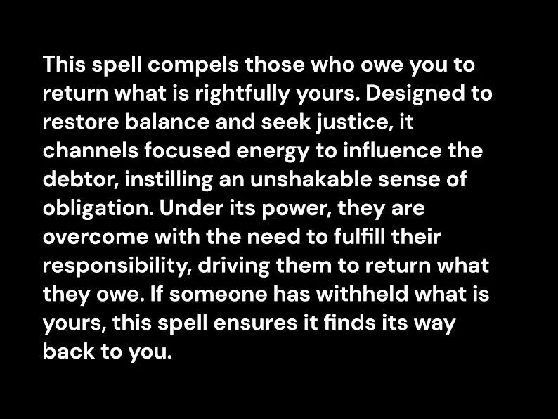 This spell compels those who owe you to return what is rightfully yours. Designed to restore balance and seek justice, it channels focused energy to influence the debtor, instilling an unshakable sense of obligation. Under its power, they are overcome with the need to fulfill their responsibility, driving them to return what they owe. If someone has withheld what is yours, this spell ensures it finds its way back to you.