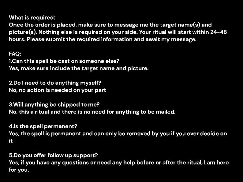 Once the order is placed, make sure to message me the target name(s) and picture(s). Nothing else is required on your side. Your ritual will start within 24-48 hours. Please submit the required information and await my message.